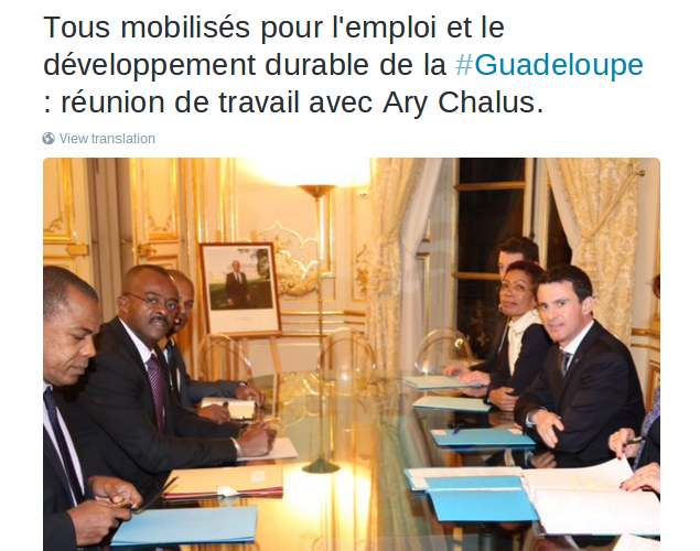 Le nouveau Président de la Région Guadeloupe, Mr Ary Chalus a été reçut lundi à 18h30, par Manuel Valls. Plusieurs sujets brûlants ont été abordés durant cette rencontre de travail, où semble t-il le Ministre a donner son accord sur l'ensemble des dossiers. Dans la même journée, Manuel Valls rencontrait les Présidents des collectivités de Martinique et de Guyane, à savoir Rodolphe Alexandre et Alfred Marie-Jeanne.